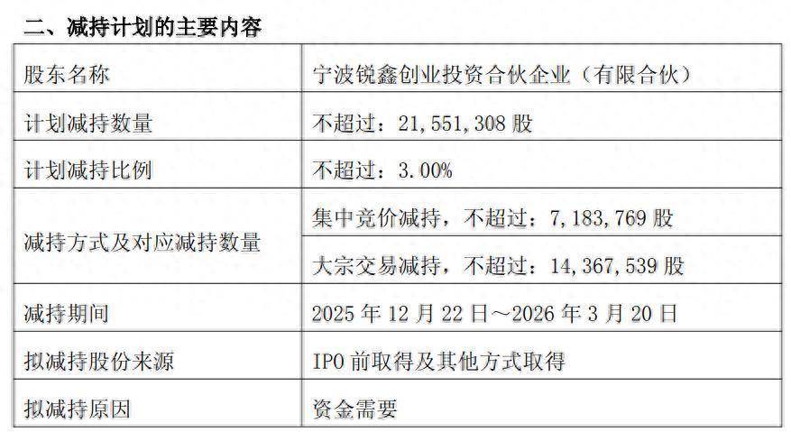 公告清晰,宁波锐鑫狡计通过连结竞价及巨额走动形势减执不妥先21,551,308股公司股份,占公司总股本718,376,999股的3%。其中通过连结竞价走动形势减执不妥先7,183,769股,占公司总股本的1.00%,通过巨额走动形势减执不妥先14,367,539股,占公司总股本的2.00%;减执技巧自公司减执狡计公告败露之日起十五个往昔日后的三个月内。且任性相连90日内通过连结竞价形势减执的股份总和不妥先公司股份总和的1.00%。任性相连90日内通过巨额走动形势减执的股份总和不妥先公司股份总和的2.00%。若减执技巧公司有派息、送股、成本公积金转增股本、配股等除权除息事项,减执股份数目将相应改换。上述股份减执价钱按照商场价钱笃定。