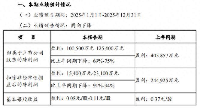 此前,公司于1月31日发布的2025年度事迹预报,展望归母净利润为10.05亿元至12.54亿元,同比大幅下跌69%至75%;扣除非时时性损益后的净利润展望在1.54亿元至2.31亿元之间,同比下跌91%至94%。