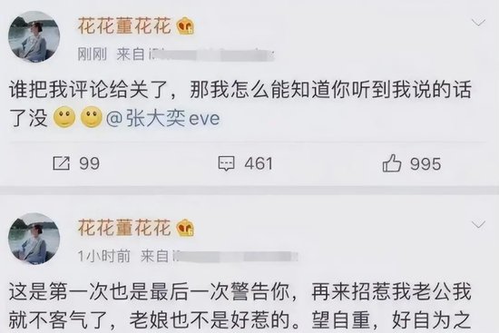 2020年4月,蒋凡夫人董花花微博公开点名网红张大奕:“这是第一次亦然终末一次警告你,再来招惹我老公我就不客气了,老娘也不是好惹的。望自爱,好利己之。”