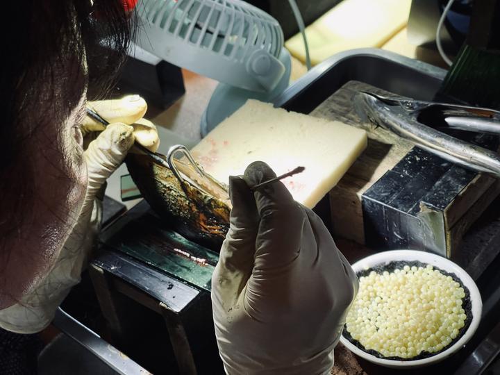 山下湖镇一处珍珠孳生基地内,一位工东说念主正在向蚌壳内插种珠核。